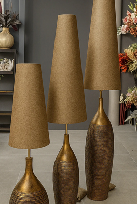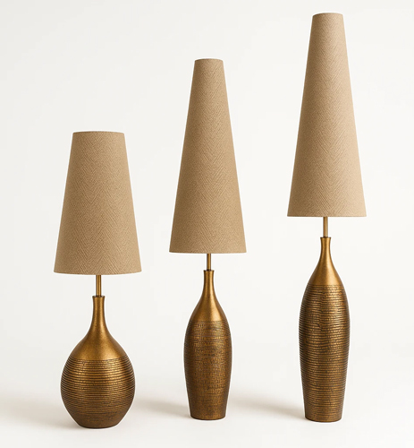 آباژور طلایی و بافت حصیری مانلیاستور، ترکیبی از هنر مدرن و حس صمیمیت طبیعت است. طراحی باریک و کشیده شِید با بافت حصیری، در کنار پایهای براق با رنگ طلایی متالیک، جلوهای هماهنگ از گرما و درخشش به فضا میبخشد.
