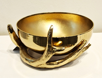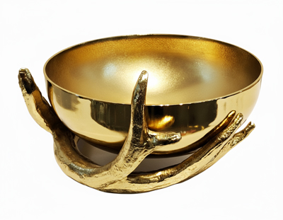 - طراحی:کاسه کروی طلایی با فضای داخلی مات و سطح خارجی براق، قرار گرفته درون دو شاخه طلایی با بافت طبیعی که نقش پایه را ایفا میکند.
