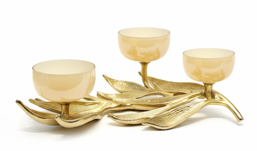 برگهای طلایی بزرگ که پایه هر کاسه را تشکیل میدهند و حالتی پویا به چیدمان میدهند.
