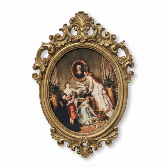 تابلو نقاشی کلاسیک با فریم بیضی طلایی آنتیک یک انتخاب خاص و چشمگیر برای دکوراسیونهای کلاسیک، نئوکلاسیک و لوکس اروپایی است. قاب بیضی این اثر با نقوش برجسته باروک–روکوکو و پرداخت طلایی آنتیک، حس اصالت و شکوه آثار کلاسیک را به فضا منتقل میکند.