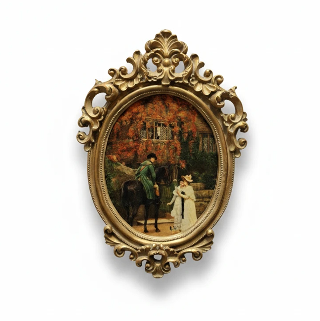 تصویر نقاشی کلاسیک با فضاسازی رمانتیک و رنگبندی گرم، در کنار فریم مجلل و حجیم، این تابلو را به یک المان دکوراتیو مستقل و ویترینی تبدیل کرده که بهتنهایی میتواند هویت دیوار را شکل دهد. ابعاد حدود ۴۰ سانتیمتر، آن را برای فضاهای مسکونی و رسمی کاملاً کاربردی کرده است.