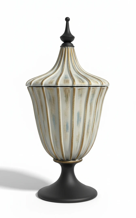 این جار تزئینی با طراحی فُرم منحنی و درپوش مخروطی بلند، یادآور ظرفهای سلطنتی اروپایی است. بدنه آن از پلیرزین مستحکم با پوشش رنگ کهنهکاریشده به سبک آنتیک ساخته شده و خطوط عمودی طلایی و سفید روی سطحش جلوهای ظریف از نور و سایه ایجاد میکند. پایه و نوک درپوش با رنگ مشکی مات، تضادی چشمگیر و لوکس به طراحی میافزایند.