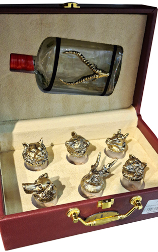 جعبه چرم مشکی 6 عدد جام و راشل و بطری برنز Art Kan