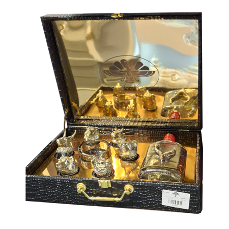 جعبه چرم مشکی 6 عدد جام و راشل و بطری برنز Art Kan