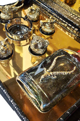 ست هدیه لوکس Art Kan شش عددی یکی از کاملترین و تشریفاتیترین محصولات این برند برای پذیرایی رسمی و هدیههای VIP است. این ست شامل ۶ عدد جام شیشهای تزئینشده با المانهای برنزی کلاسیک بههمراه یک بطری شیشهای برنزی و راشل (زیرلیوانی / زیرسیگاری دکوری) بوده که همگی درون جعبه چرمی مشکی با داخل طلایی آینهای چیدمان شدهاند.