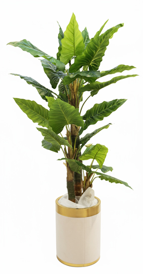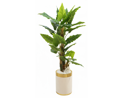 درختچه فیلودِند رنا برگدرشت سهشاخه ۱۸۰ سانتیمتری با گلدان استوانهای طلایی–سفید، یک انتخاب چشمگیر برای ترکیب حس طبیعی سرسبز با جاذبه لوکس رنگ طلایی است.