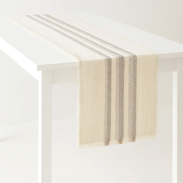 رانر مینیمال و شیک با تم کرم شیری و طرح راهراه ظریف، انتخابی ایدهآل برای ایجاد جلوهای گرم و آرام بر روی میز پذیرایی یا میز ناهارخوری. کیفیت بالای بافت و رنگ خنثی آن، باعث هماهنگی کامل با چیدمانهای مدرن، مینیمال و حتی روستیک میشود.