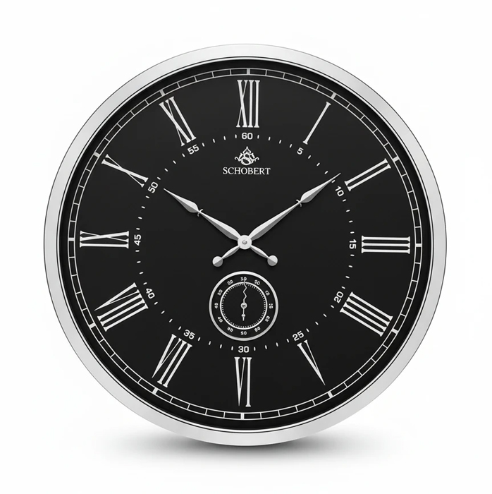 ساعت دیواری تکموتوره شوبرت قطر 50 سانتیمتر مشکی نقرهای ترکیبی بینقص از سادگی کلاسیک و ظرافت مدرن است. صفحه مشکی مات در کنار اعداد رومی نقرهای کشیده و قاب نقرهای براق، ظاهری شیک، رسمی و بسیار خوانا ایجاد کرده است.