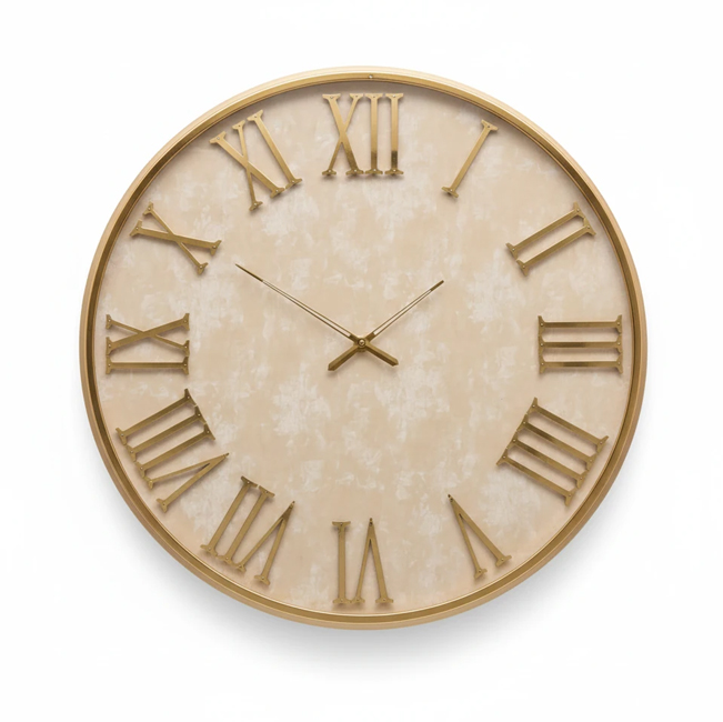 ساعت دیواری دیاکو قطر ۷۰ سانتیمتر انتخابی ایدهآل برای فضاهایی است که به یک المان دکوراتیو شاخص و شیک نیاز دارند. صفحهی بژ با بافت ابری–سنگی در کنار اعداد رومی فلزی طلایی برجسته، جلوهای کاملاً کلاسیک–لوکس ایجاد کرده که بهراحتی مرکز توجه فضا میشود.