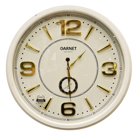 ساعت دیواری GARNET با صفحه سفید براق و اعداد برجسته طلایی، جلوهای روشن، لوکس و بسیار خوانا به فضا میبخشد.