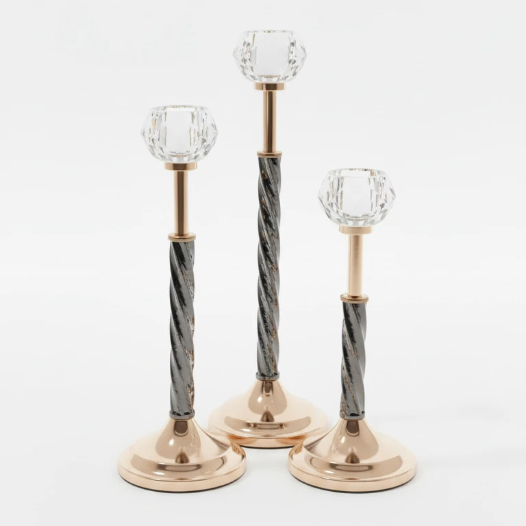 ست سهتکه شمعدان مشکی و طلایی با سر کریستالی تراشدار