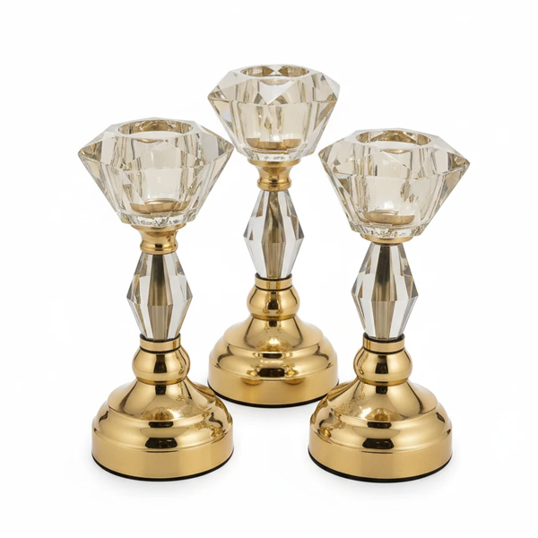 ست سهتکه شمعدان کریستالی با میلهی طلایی و پایه شفاف حبابدار