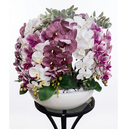 ست گل مصنوعی ارکیده در گلدان دایره سفید بزرگ