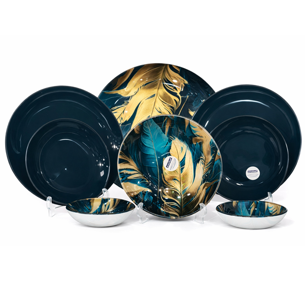 سرویس غذاخوری ۶ نفره دِمدستی رنگی طرح پر ترکیبی چشمنواز از هنر، رنگ و کیفیت است که برای میزهای خاص و دکورهای شیک طراحی شده. رنگ غالب سبز یشمی عمیق در کنار نقوش پر طلایی، جلوهای لوکس، گرم و هنری به این سرویس داده که آن را از مدلهای معمولی کاملاً متمایز میکند.