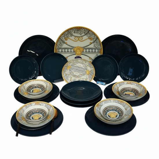 نقوش الهامگرفته از سبک ورساچ با جزئیات دقیق و مدالیون مرکزی طلایی، این سرویس را به یک انتخاب خاص برای مهمانیهای رسمی، پذیراییهای لاکچری و جهیزیههای سطح بالا تبدیل کرده است.