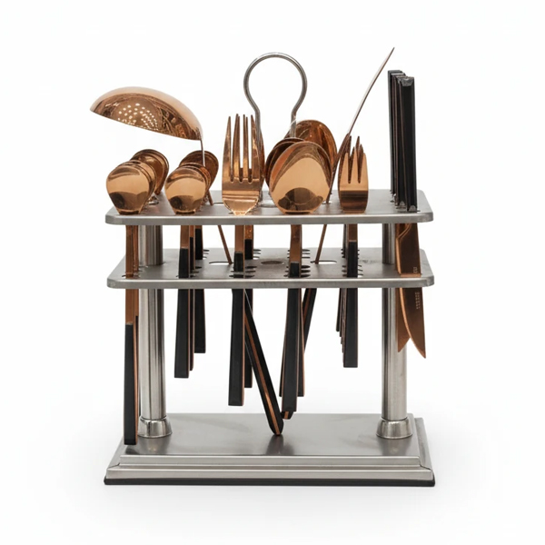 این سرویس شامل قاشق و چنگال کامل برای ۶ نفر بههمراه ست کفگیر و ملاقه هماهنگ است که همگی روی استند فلزی شیک قرار گرفتهاند.