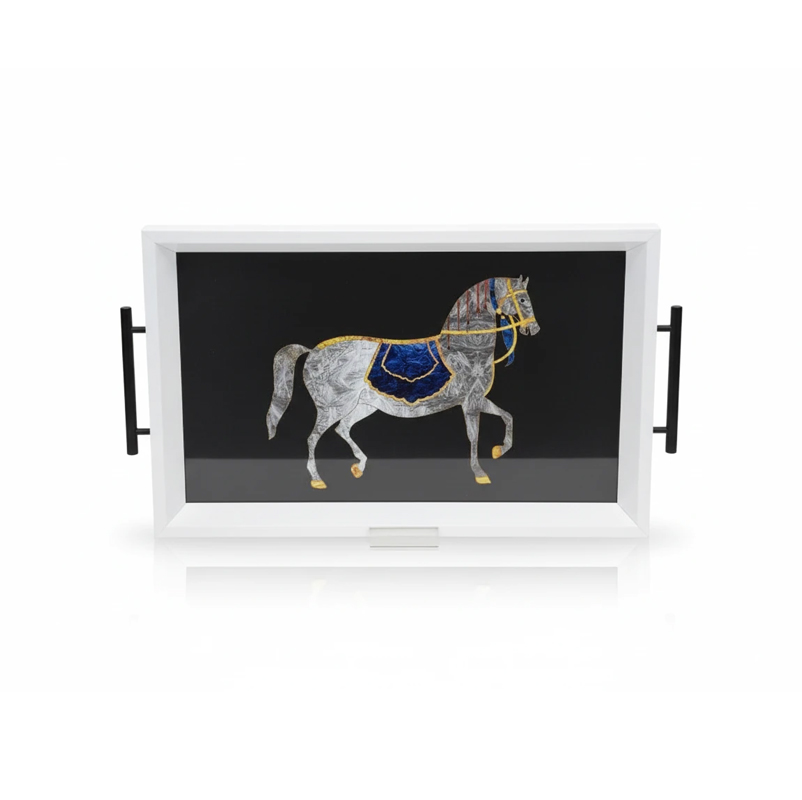 تصویر اسب با جزئیات ظریف و رنگهای کنترلشده بر زمینه تیره، در کنار قاب سفید و دستگیرههای مشکی فلزی، جلوهای گالریمانند و فاخر ایجاد کرده که این سینی را فراتر از یک وسیله پذیرایی و به یک آیتم دکوری شاخص تبدیل میکند.