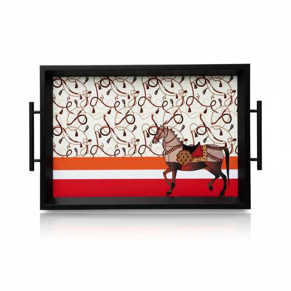 پسزمینهی طرحدار الهامگرفته از نقوش اسب، در کنار نوارهای رنگی کنترلی و تصویر اسب با جزئیات دقیق، این سینی را به یک آیتم دکوری شاخص تبدیل کرده است.