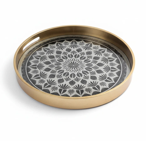سینی دکوراتیو گرد قاب طلایی طرح هندسی سیاه و سفید، جلوهای از ترکیب هنر و سادگی مدرن در دکوراسیون لوکس مانلی استور است. طرح هندسی منظم با رنگهای خنثی سفید و مشکی بر زمینهی طلایی، تعادل کاملی میان سادگی مینیمال و درخشش طلایی کلاسیک ایجاد کرده است.