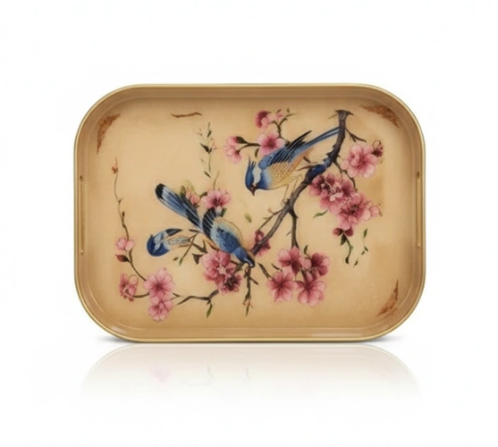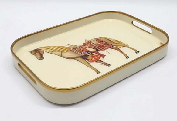 زمینهی سبز و نارنجی و سرمهای و کرم درخشان و طرح اسب طلایی، طرح پرندگان روی شکوفه طلایی‑کرمی ، طرح گل آبی زمینه سرمهای روی لبههای فریبنده، این سینی را به اثری نمایشی در ایدهآلترین سبک Hermes تبدیل کرده است. برای پذیرایی و نمایش دکوری بینقص.