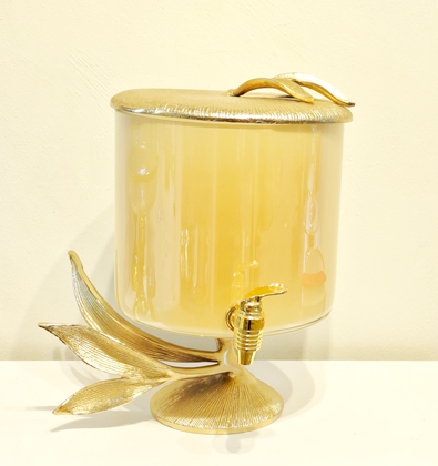 یک ظرف سرو نوشیدنی لوکس با طراحی برگهای طلایی که الهام گرفته از فرمهای طبیعی و هماهنگ با کلکسیون طلایی–چوبی و ظروف شاخهای است.