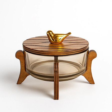 ظرف پذیرایی شیشهای پایهدار با درب چوبی طرح گنجشک یکی از طراحیهای منحصربهفرد مانلیاستور است که در آن شفافیت شیشه و گرمای چوب طبیعی در هماهنگی کامل قرار گرفتهاند.