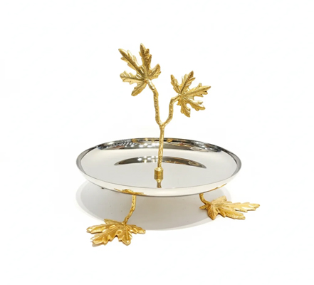 یک ظرف پذیرایی با طراحی خاص برگهای طلایی که ترکیبی از ظرافت طبیعتگرایانه و درخشش مدرن است.