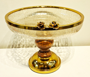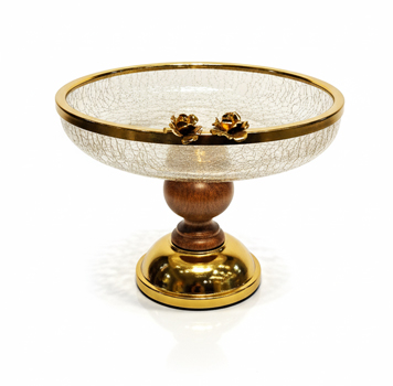 یک شیرینیخوری پایهدار ترکیبی طلایی و چوبی با کاسه شیشهای آبگز است، که طراحی آن بین کلاسیک و مدرن تعادل جالبی دارد.