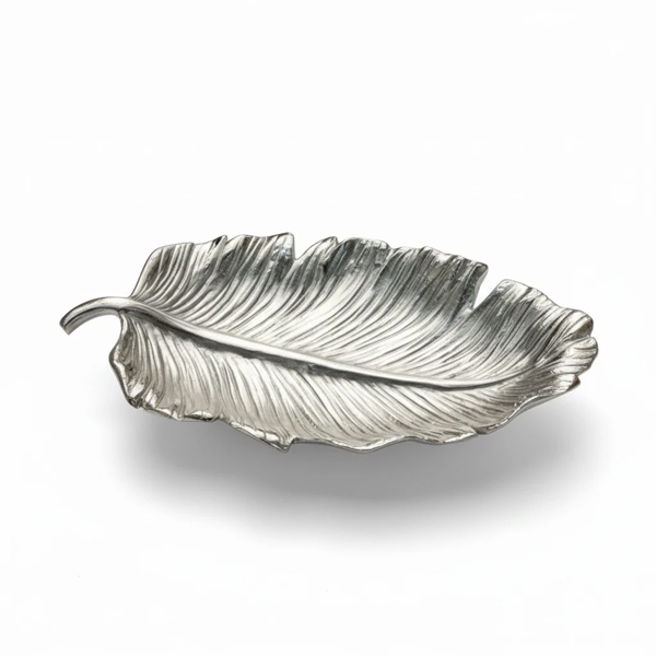 ظرف پذیرایی برگ طلایی و نقره ای، اثری لوکس و طبیعتمحور از مانلی استور است که با الهام از فرم برگ استوایی طراحی شده.