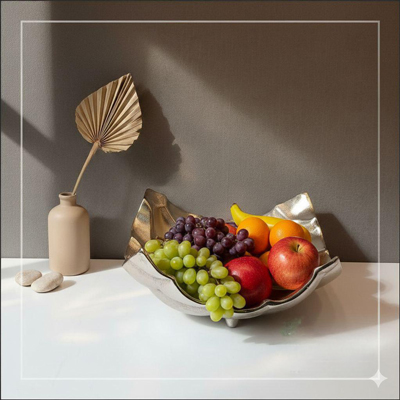 میوهخوری آلومینیوم سیلور مدل کندو 35 سانت مانلی استور با طراحی هندسی خاص و لبههای رو به بالا، جلوهای مدرن و متفاوت به میز پذیرایی شما میبخشد. این محصول از آلومینیوم سبک و مقاوم ساخته شده و با روکش سیلور براق خود، بازتابی درخشان و لوکس ایجاد میکند. شکل کندویی آن علاوه بر زیبایی بصری، به مرتب نگه داشتن میوهها کمک میکند و برای سرو دسر یا شیرینی نیز مناسب است. پایههای کوتاه فلزی باعث ثبات بیشتر ظرف و ارائه حرفهایتر خوراکیها میشود.