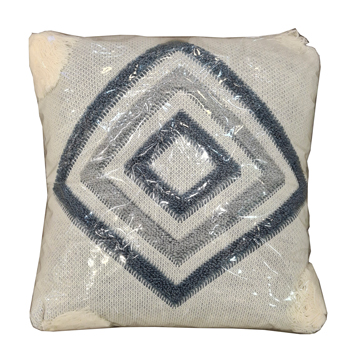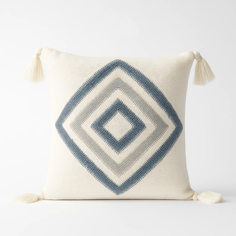 کوسن طرح لوزی از پارچه بافت ریز و نخ پلیکاتن نرم تولید شده است. نقشدوزی لوزی دوبل با رنگ آبی خاکستری جلوهای از مدرنیته آرام دارد و دوخت دقیق لبهها فرم منظم کوسن را حفظ میکند.