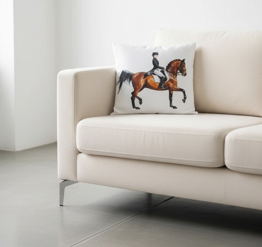 تصویر اسب قهوه‌ای با سوارکار مشکی و سفید نمادی از قدرت و ظرافت است که در هر فضای نشیمن یا پذیرایی، جلوه‌ای منحصر‌به‌فرد ایجاد می‌کند. این کوسن با رنگ‌های طبیعی و تضاد متعادل بین سفید و قهوه‌ای، برای هماهنگی با مبلمان مدرن، کرمی، یا خاکی فوق‌العاده است.