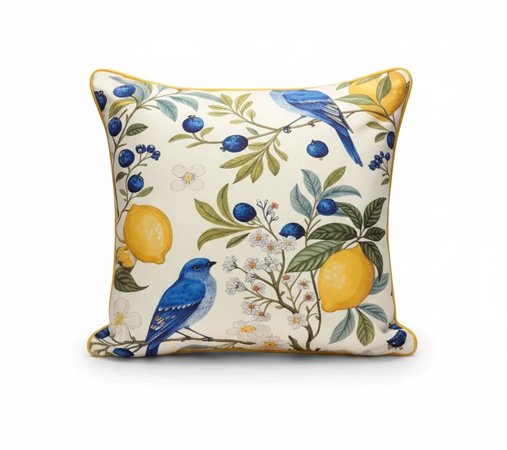 این کوسن با استفاده از پارچهای باکیفیت و چاپ دقیق دیجیتال، جزئیاتی لطیف از نقوش طبیعی را بازآفرینی کرده است — پرندههای آبی روی شاخههای سبز و لیموهای زرد براق میان گلهای سفید کوچک. ترکیب این رنگها جلوهای درخشان و دلپذیر به فضا میبخشد و کوسن را به نقطهای چشمنواز در چیدمان مبلمان تبدیل میکند.
