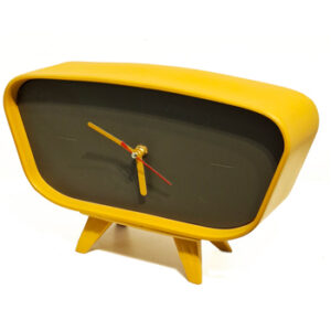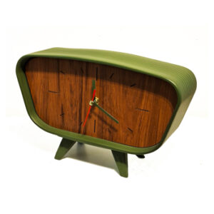 این ساعت رومیزی با طراحی الهامگرفته از فرم تلویزیونهای کلاسیک و رنگ های :خردلی، سبز، نسکافه ای ترکیبی از حس