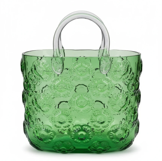 بدنهی این گلدان از شیشه سبز شفاف ساخته شده و سطح آن با طرح گلهای برجسته تزئین شده است. دستههای شفاف زیبایی آن را دوچندان کرده و ظاهر آن را شبیه یک کیف شیشهای لوکس جلوه میدهد.
