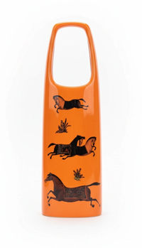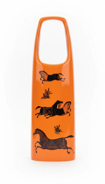 گلدان نارنجی هرمس مدل باریک از سری دکوریهای لوکس سرامیکی مانلی استور است. فرم کشیده به همراه دستهی هلالی، ظاهر مدرن و منحصربهفردی به این اثر داده است. نقوش اسبهای تزئینی الهام گرفته از هنر هرمس و رنگ نارنجی درخشان لعاب دار، حس تحرک و انرژی بصری ایجاد میکند.