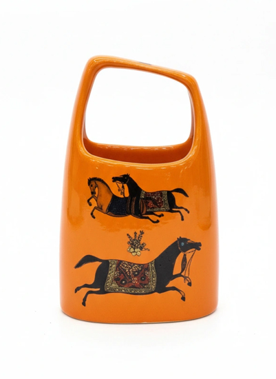 گلدان نارنجی هرمس مدل پهن از سری دکوراسیون سرامیکی لوکس مانلی استور است. این اثر با فرم پایهی پهن و دستهی بزرگ باز، تلفیقی از زیبایی عملکردی و طراحی هنری محسوب میشود. نقوش اسبهای تزئینی به سبک هرمس و لعاب درخشان نارنجی، حس تحرک و قدرت را در چیدمان منزل بازتاب میدهد.
